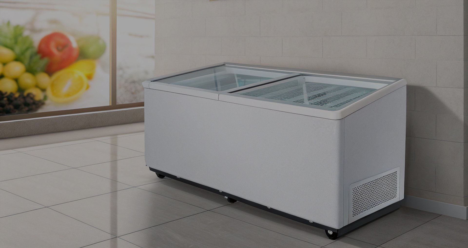 The chest display freezer, the top flat door is sliding. This type of freezer has a good effect and a large space, suitable for placing meat or packaged ice cream.
