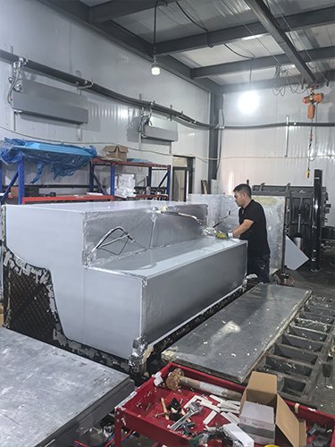 The fan housing at the bottom of the freezer is hollowed out. This hollowing is laser-cut, ensuring each hole is precisely sized and positioned. Automatically controlled by the machine, this further reduces production time.